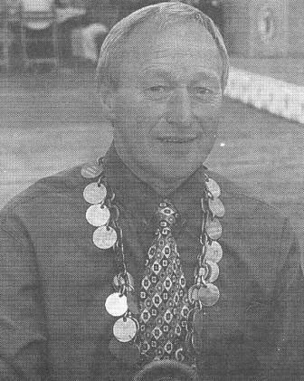 Derefter fik Niels Hald overrakt det synlige bevis på udnævnelsen Kimbrerkæden af Årets Kimbrer 1998, Ejner Holm Pedersen.