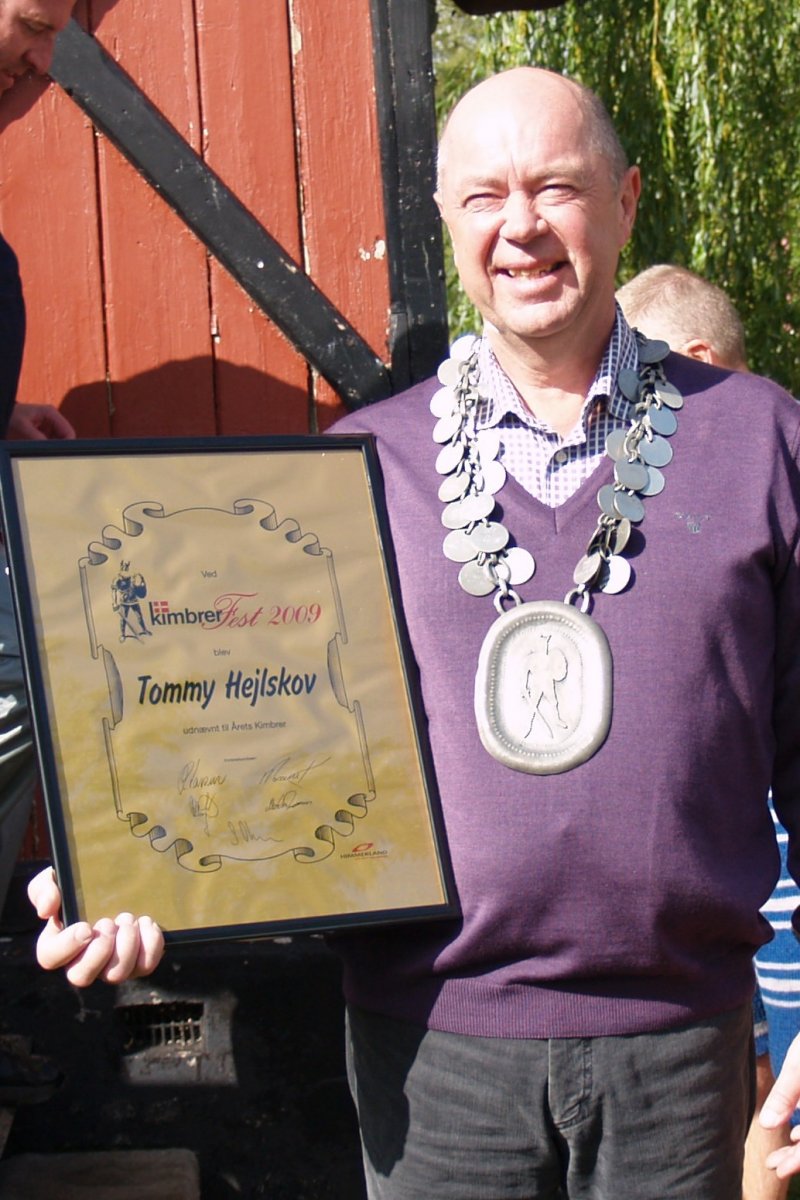 sportsmand over ham – det eneste fag, hvor han var stiv, var i gymnastik.Han har tidligere spillet badminton i Østrup IF, hvor det også blev til frivilligt arbejde i badmintonudvalget. Efter han var blevet gift, og havde fået 3 prinsesser, medførte dette, at han blev engageret i diverse forældreråd i børnehaver, formand for gruppestyrelsen hos spejderne i 4 år, og endelig 4 år i skolebestyrelsen, der fik glæde af hans arbejdsindsats. Hans børn har altid stået meget højt for ham, og han er stadig meget involveret i deres gøremål. I 1975 fik Kimbrerfesten første gang hjælp fra ham med opbygningen af scenen. Vi har sidenhen ofte måttet ligge øre til, at det er ham, der har ”opfundet” den scene vi står på her. Efter at have klaret dette og andet arbejde for festen i en del år, blev han opfordret til at blive materielmand i Kimbrerfestkomiteen. Dette job klarede han så i 5 år. Så var han tilpas rustet til at overtage formandsstolen. Her sad han så i ikke mindre end 13 år. Den rekord bliver vist svær at slå – jeg gør mig i hvert fald ingen forhåbninger i den retning!! I 2003 blev han medlem af Lions klubben her i Aars. Det er foreløbigt blevet til 2 år i bestyrelsen, men med udsigt til yderligere 3, da han lige er startet som Præsident. Tommy – ja det kan jo nok ikke skjules mere, hvem vi har med at gøre. Da jeg i sin tid spurgte dig, om du ville være Årets Kimbrer, var din første kommentar: ”vil du virkelig, at jeg skal gå sammen med den flok gamle nisser”. Ja - Tommy du må jo have indset, at du også selv bliver ældre. Du har i hvert fald sagt ja – og ja, den bemærkning må du jo så selv redde dig ud af ovre i Stakladen bagefter. Men du indtræder nu i rækken af Årets Kimbrere som nummer 37.Den første, der modtog denne hæder, var netop også en tidligere formand, Grosserer P. Hostrup Pedersen helt tilbage i 1973. Efterfølgende har både Evan Bollesen i 1981 og Christian Oksen i 1985 modtaget denne hæder, bl.a. i kraft af arbejdet for Kimbrerfesten. En af forudsætningerne for at blive Årets Kimbrer, er at man har udført et stort og frivilligt arbejde for sporten i Aars. Med den indsats du har gjort gennem 18 år i Komiteen, har Kimbrerfesten udviklet sig enormt. Dette har jo så dryppet på alle Kimbrerfestens medlemsklubber i kraft af et stort set støt stigende overskud, så der er mange mennesker der er dig en tak skyldig. Derfor skal du have denne hæder, som er det højeste man kan opnå som frivillig leder i AarsKære Tommy du er en mand jeg er stolt over at kende, du er altid i godt humør, du er engageret i det du påtager dig, du er altid frisk med nye ideer, du er utroligt loyal overfor dem du arbejder sammen med, og så er du ja bare fantastisk at være sammen med.Derfor er det mig en stor ære at kunne udnævne dig til Årets Kimbrer 2009.Mine damer og herrer – tag rigtig godt imod Tommy Hejlskov.